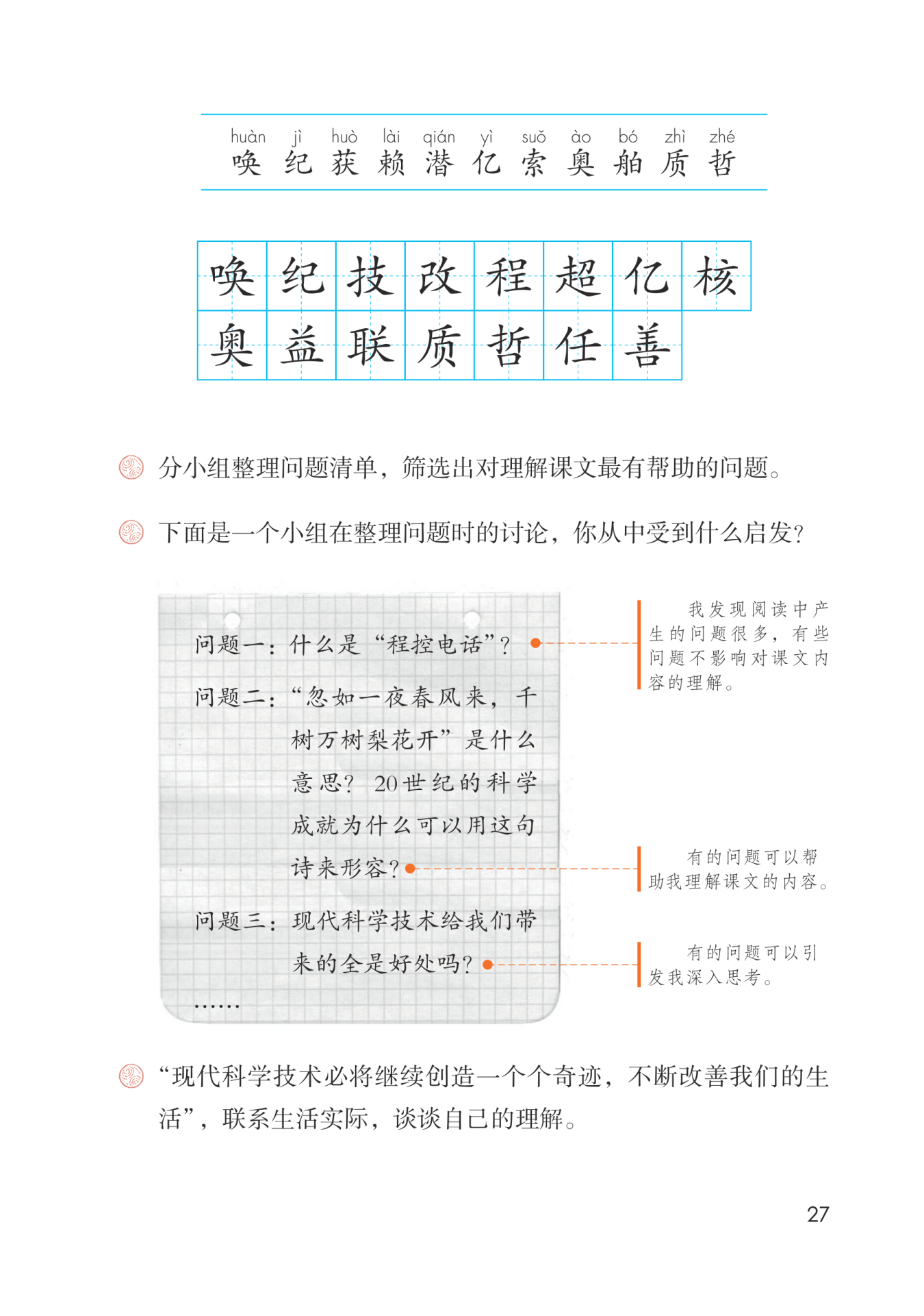 整理问题要把旁批和课文后的问题进行分类,各类别之间是并列关系,不能互相包含。大家提出的问题有的是关于内容方面的,有的是关于写法方面的,还有的是关于获得启发或者联系生活实际方面的。我们可以从以下几个方面筛选:一是不懂的词语(如什么是“物质生活”“哲学家”等);二是不懂的句子;三是不理解的内容。去掉重复的问题,按照类别把问题整理好,为下一步的交流做准备。