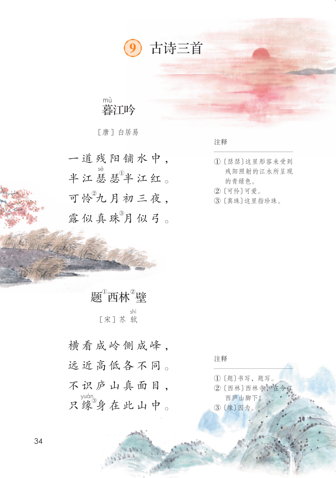 译文:傍晚时分,快要落山的夕阳,柔和地铺在江水之上。