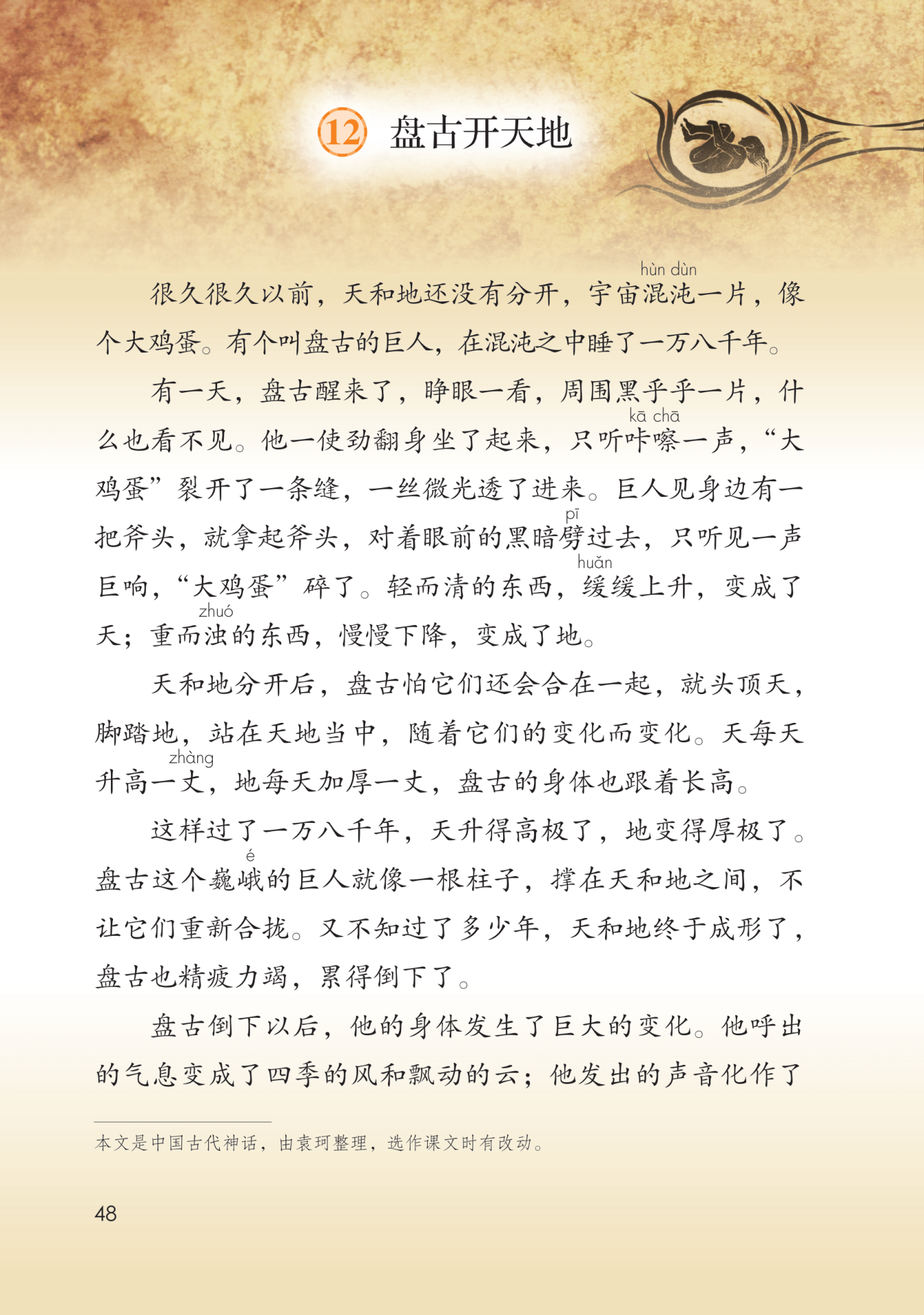 中心思想:这篇神话传说讲的是一个名叫盘古的巨人开天辟地的故事,塑造