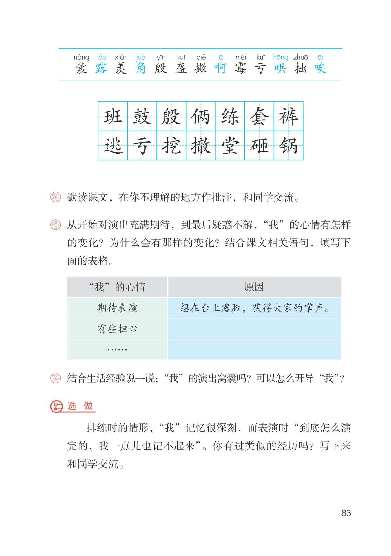 带着问题读课文,在文中画出有关人物动作、语言、神态描写的句子,想一想此时“我”的心情是怎样的,为什么会有那样的变化,再来填一填表格。