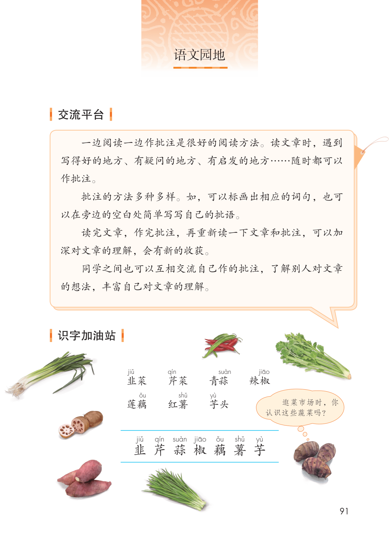 这七个词语都是蔬菜的名字。其中,“芹、蒜、藕、薯、芋”这几个生字的偏旁都是草字头。“辣椒”的植株像一棵微型的树,所以“椒”字的偏旁是木字旁。“韭”字是象形字,写法就像韭菜长在地上的形状。所以,我们可以结合字形特点和教材上的图片来识记这些生字。