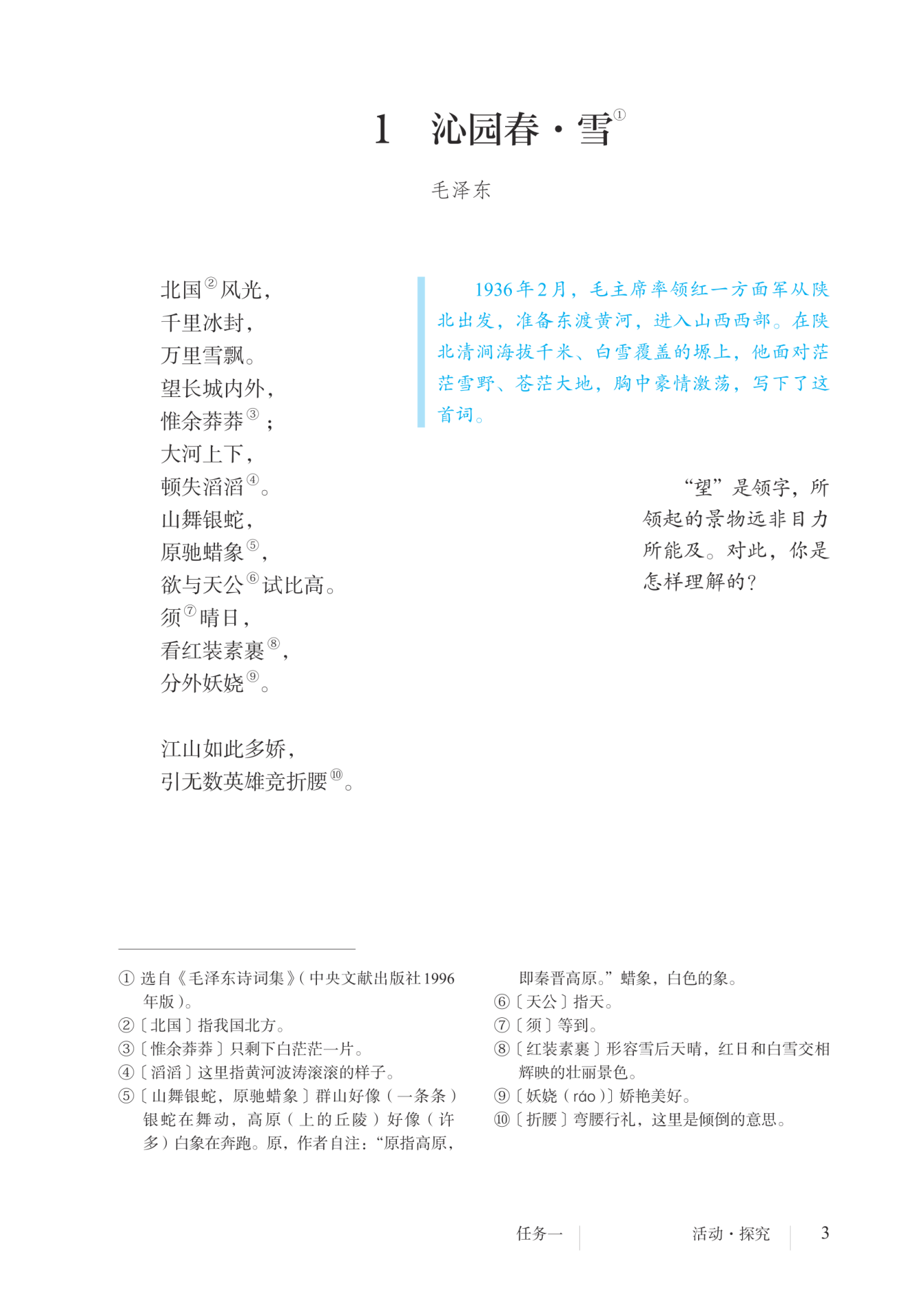 主题思想 本词通过描写雄伟壮阔、妖娆美丽的北国雪景,纵论历史上的英雄人物,