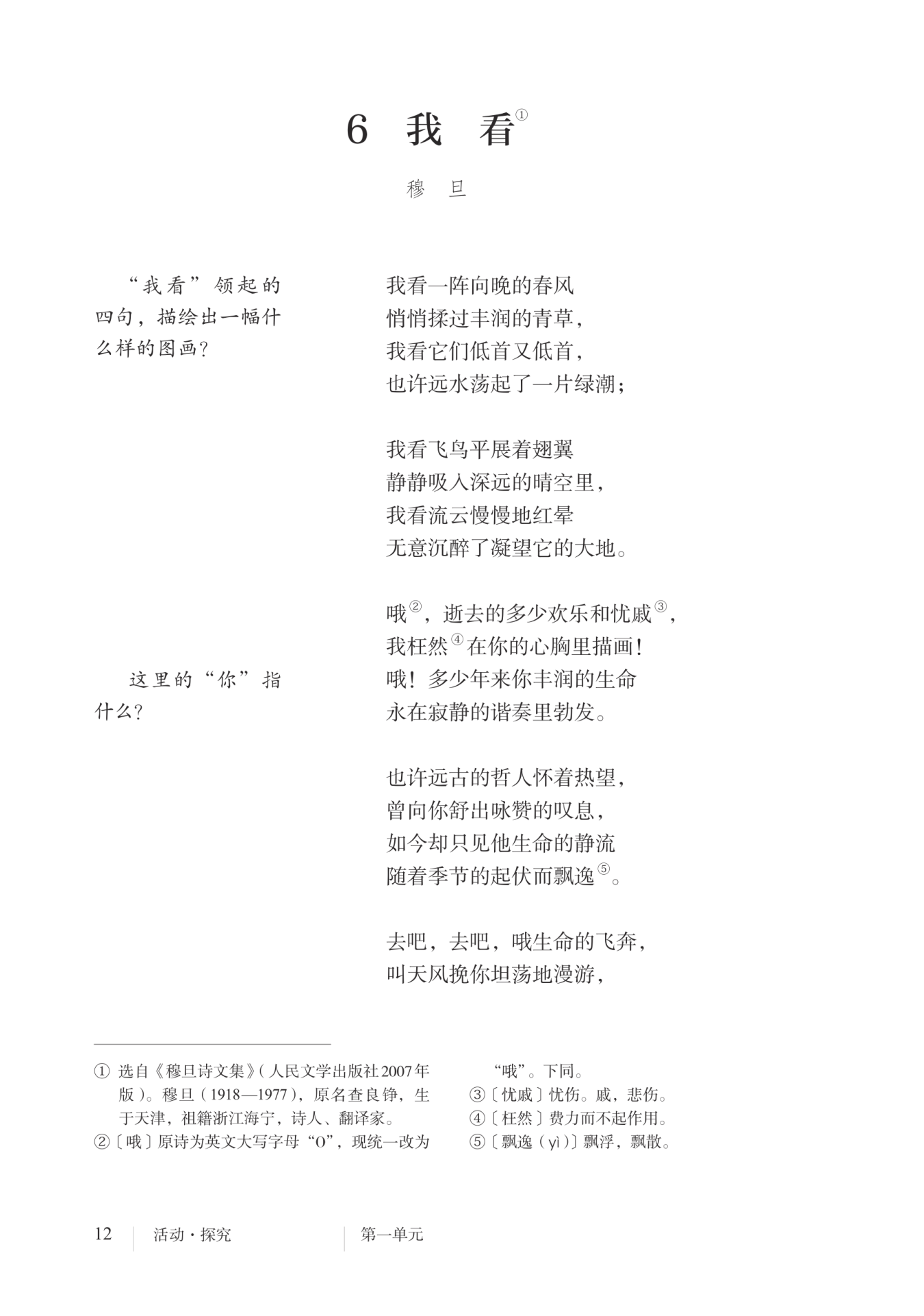 在第一节中,“我”看到的是自然的生机与活力。“低首又低首”,运用拟人修辞,赋予青草以人的情态,描绘出了一幅风吹草低的生动图景。诗人由此展开想象,也许远方正有一片春水也在春风的吹拂下微微荡漾。