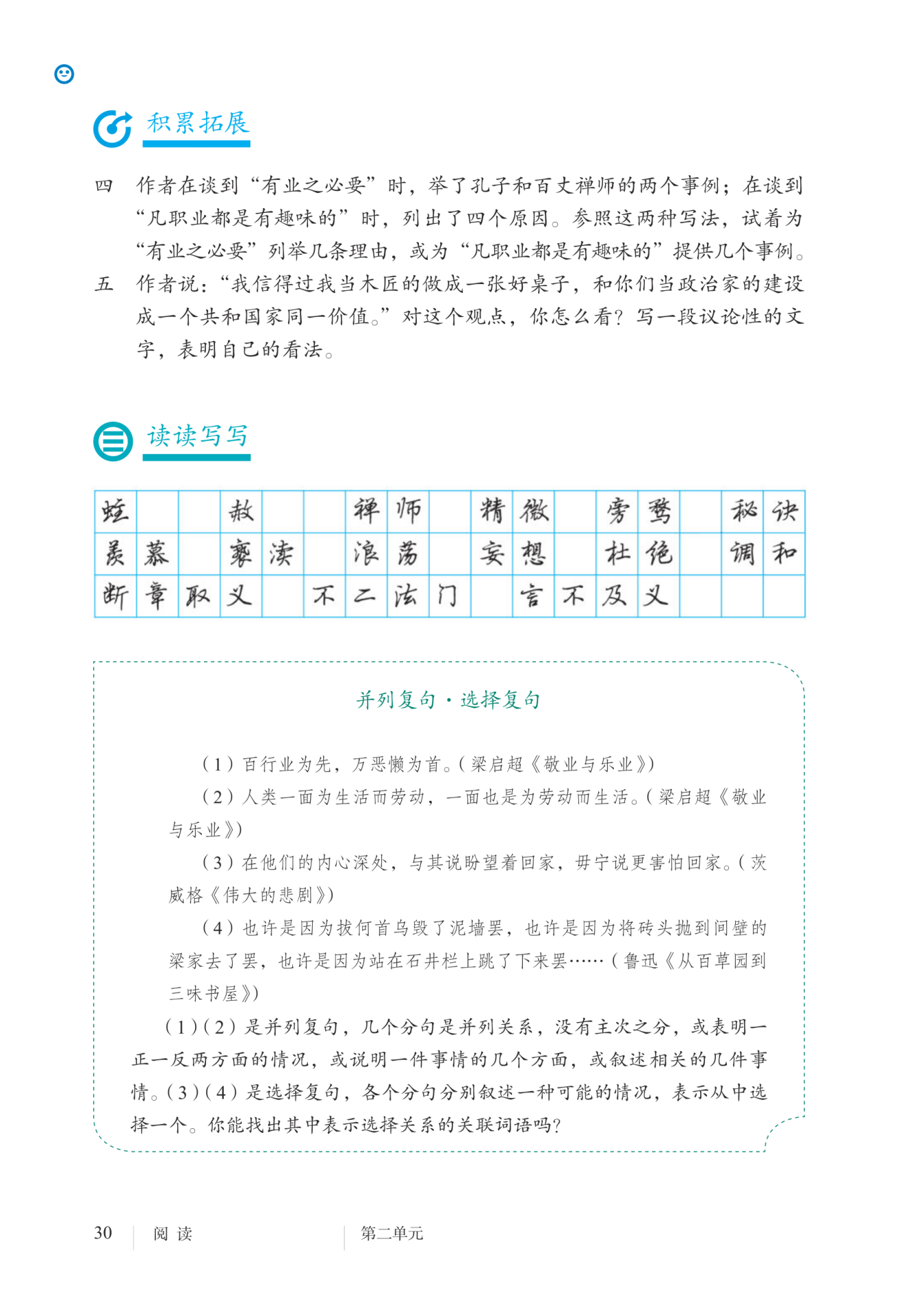 “有业之必要”的理由:①可以谋生,使自己在经济上独立,人格上自尊,不需要依赖他人,仰人鼻息,受人牵制;②使自己的身心有所安顿,不至于无所事事,烦闷无聊;③从业过程中的困难、挫折、烦恼,是对意志和品性、能力和才干的锻炼。