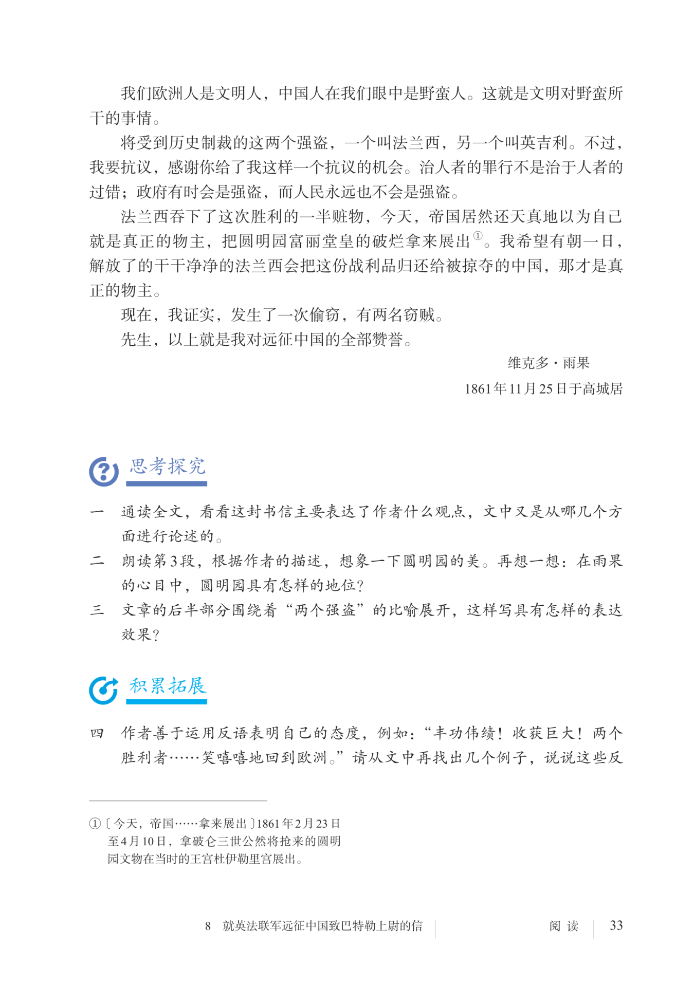 最后两段话是作者重申自己的立场,再次指出自诩文明的英法联军的“远征”是彻头彻尾的偷窃,并以“全部赞誉”反讽,照应开头。