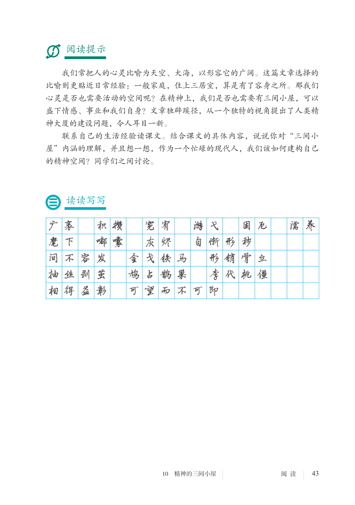 (1)第一间“盛着我们的爱与恨”,侧重人之常情,是精神世界最普遍,最基础的情感;第二间“盛放我们的事业”,即寻找并从事自己热爱的事业,指向的是个体精神的纯粹和充沛;第三间“安放我们自身”,即要有独立的思想,指向的是内在精神的丰盈,自我精神的健全、独立。三间精神小屋的内涵各有侧重,从情感到理性的构建,逐步提高,共同构建了作者心中的精神大厦。(2)结合自身情况阐述,言之有理即可。