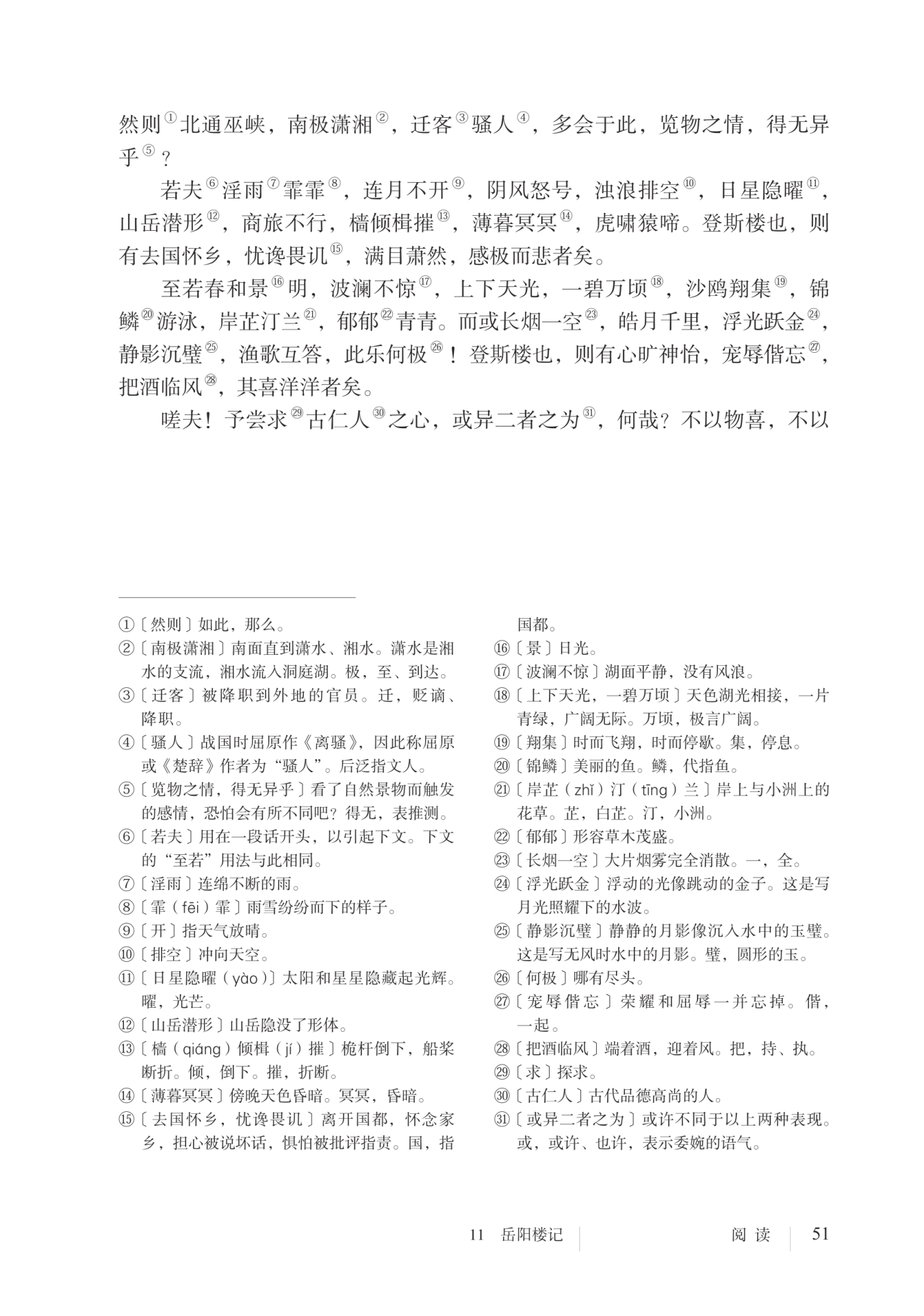 以“若夫”的虚拟语气起笔,含蓄委婉。用一连串的四字短句,层层渲染,渐次铺叙,写天气的恶劣,人心的酸楚,突出了一种悲凉的情境,可谓一幅“洞庭风雨图”,也为下文抒写“迁客骚人”的“感极而悲”蓄势。