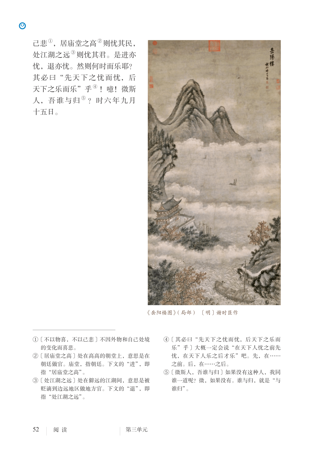 作者用一问一答,假托古圣立言,发出了“先天下之忧而忧,后天下之乐而乐”的豪言壮语,点明了全篇主旨。这是作者对待仕途进退的原则,是其忧国忧民思想的集中体现。