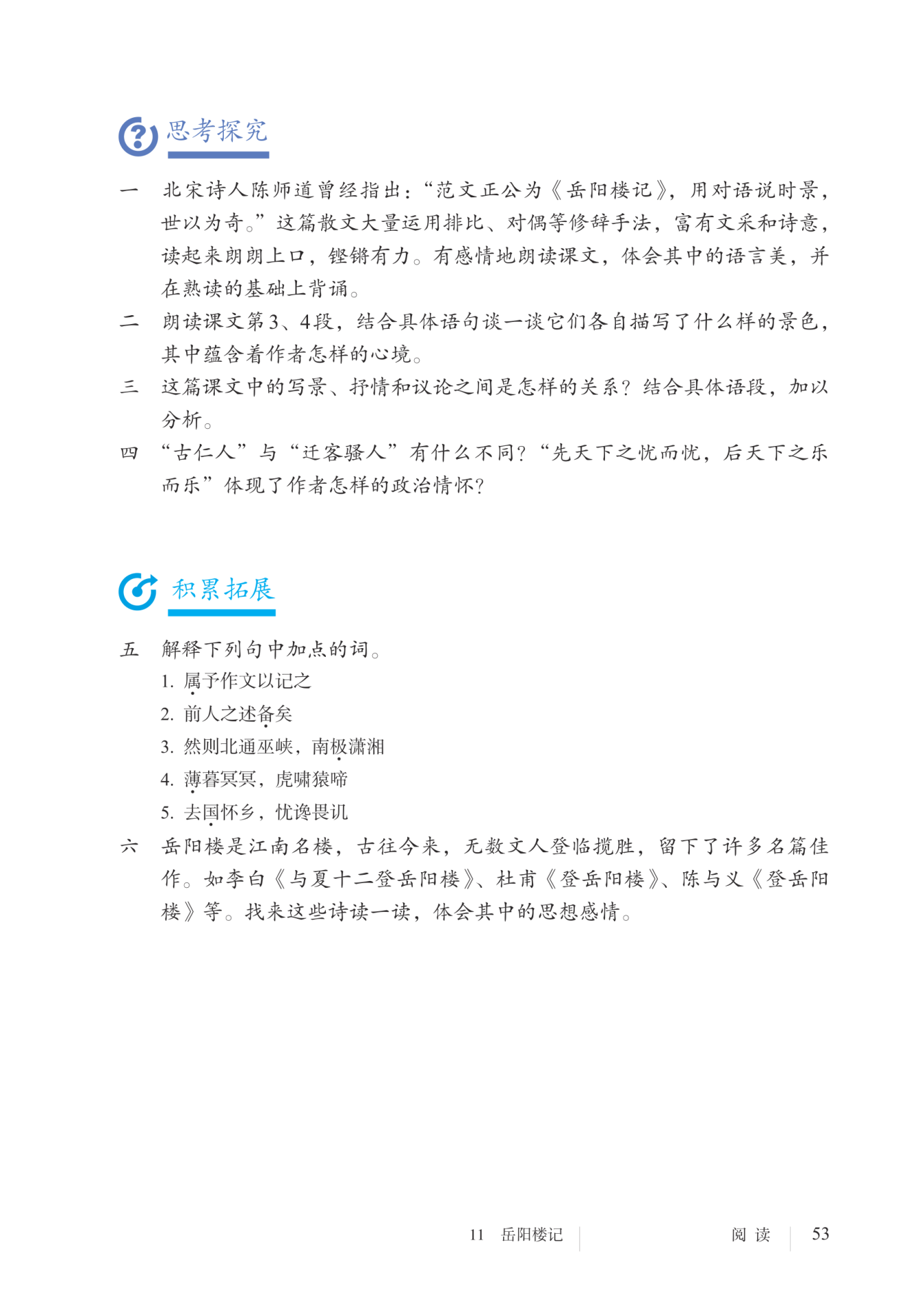 从全文看,本文写景、抒情、议论是融为一体的;具体而论,又表现出鲜明的层次性,表现出写景的独立,和议论与抒情的融合。如第2段概写洞庭景物后,以“然则”一转,接以提问式的议论;第3段写洞庭风雨,第4段写洞庭春晴,后面都接以抒情;第5段则以“嗟夫!”开头,表现出强烈的抒情色彩,然后又接以整段的议论,议论中含有抒情的色彩。文章最后又归于单纯而强烈的抒情——“噫!微斯人,吾谁与归?”这样,写景与议论、抒情相互映衬,完美地表达了作者的思想情感。