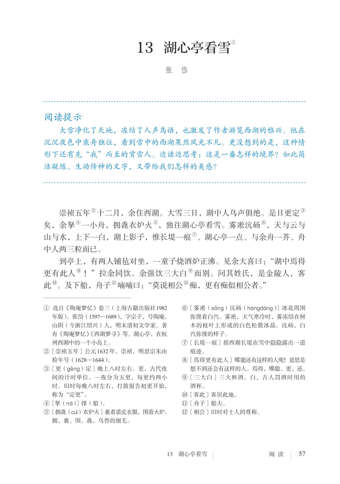 主题思想 本篇小品文以白描手法描绘了西湖雪后纯净旷丽的景色,记叙了湖心亭