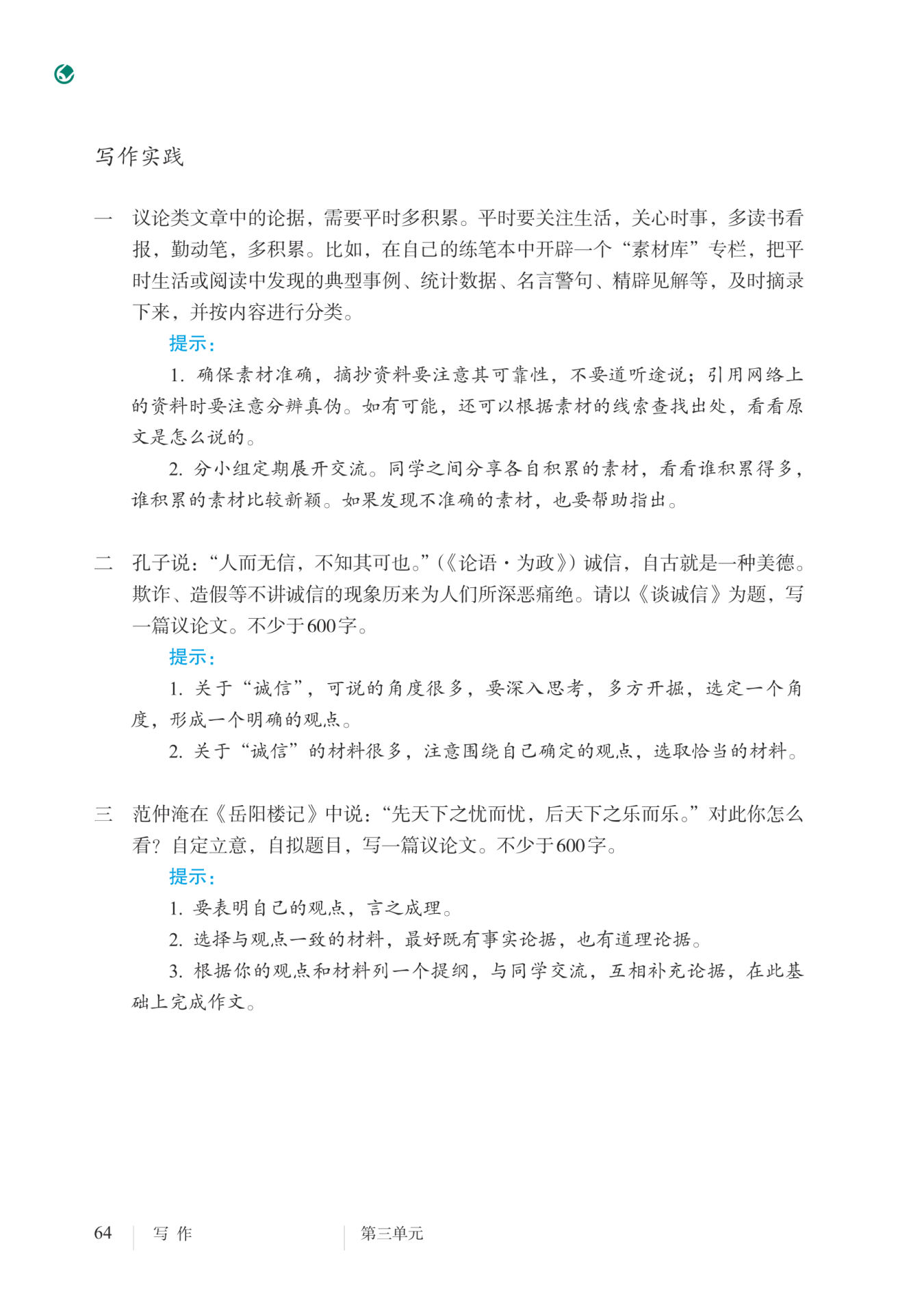 $具体论据\begin{cases}{事实论据——有关诚信的故事、实例}\\{道理论据——有关诚信的名人名言、俗语}\end{cases}$