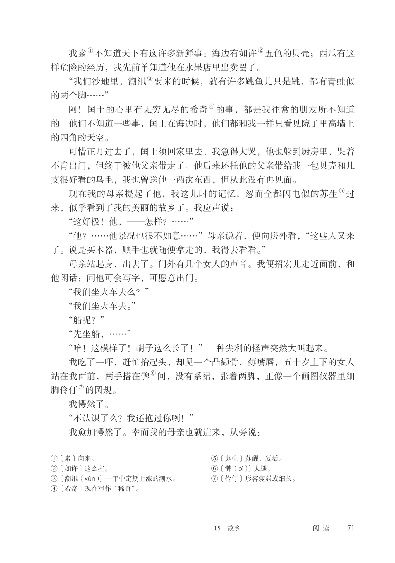 段解:将闰土丰富的生活经验与“我”和“往常的朋友”的眼界狭窄作对比,体现出“我”对闰土拥有丰富有趣生活的羡慕和向往。