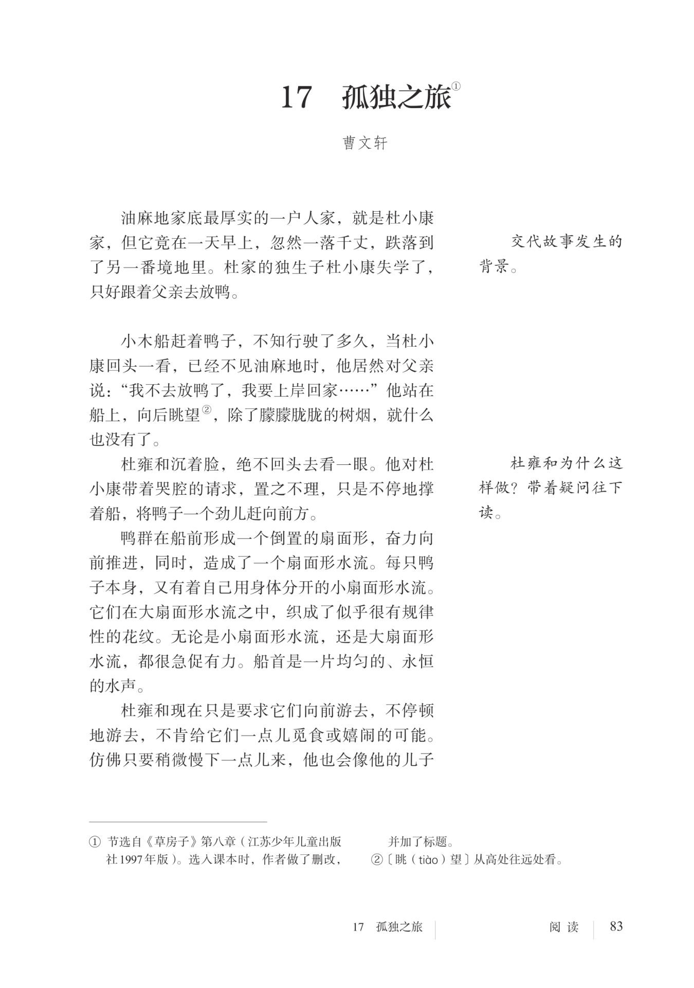 主题思想 本文通过写少年杜小康失学后跟随父亲放鸭,因而经历孤独
