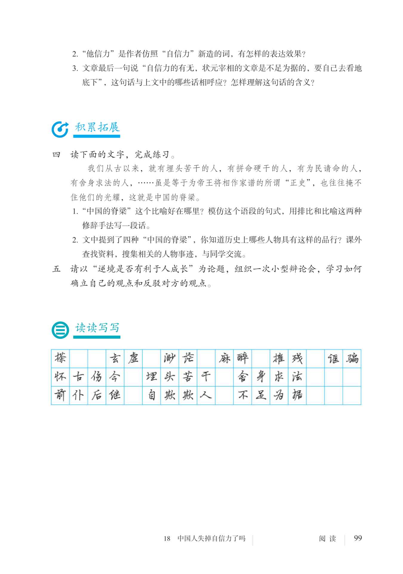 (2)“状元宰相”指当时国民党反动政客及其御用文人,“地底下”指当时还处于地下斗争状态的群众革命力量。这句话的意思是,中国人是否有自信力,不要看反动统治者渲染的舆论,而要去看那些堪称“中国的脊梁”的人的所作所为。他们虽“总在被摧残,被抹杀”,但“有确信,不自欺”,是有自信力的中国人。