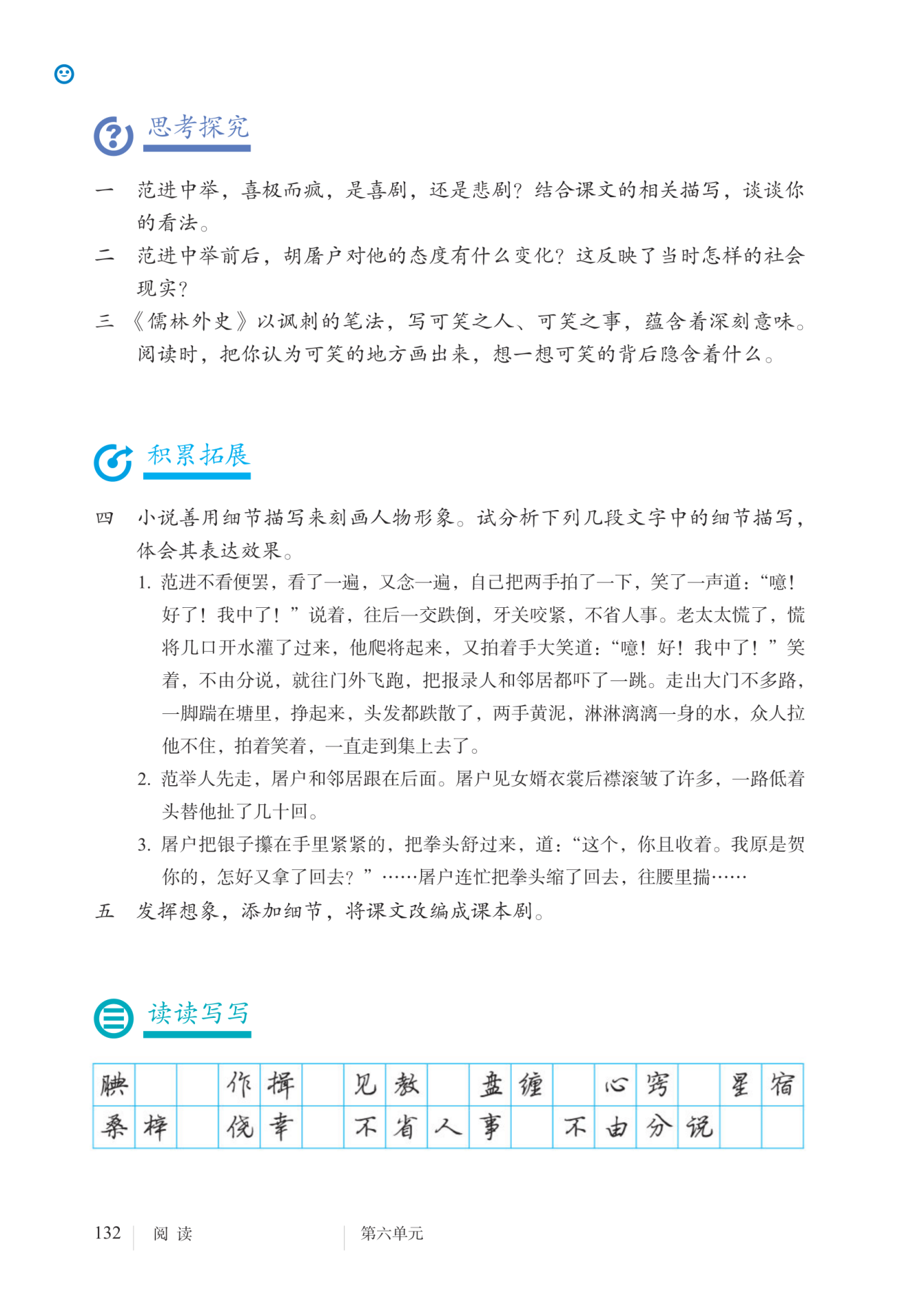 生动地描写了范进中举发疯时的语言、动作,既呈现其精神崩溃的可悲之态,也深刻地揭露了封建科举制对读书人的迫害。
