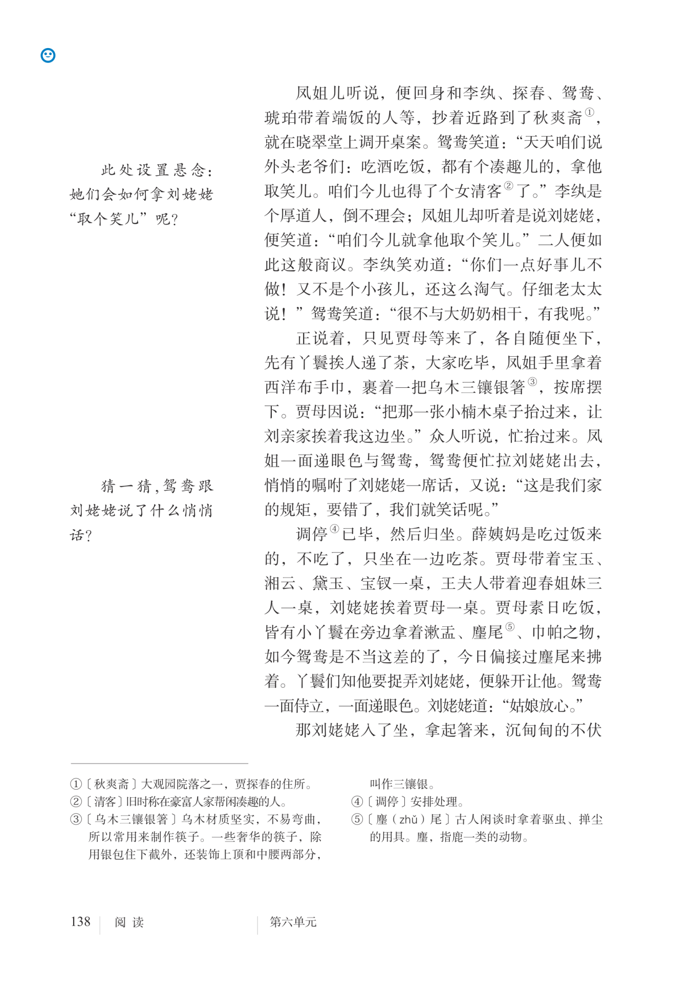 吃饭时让刘姥姥闹点儿笑话,出出丑。