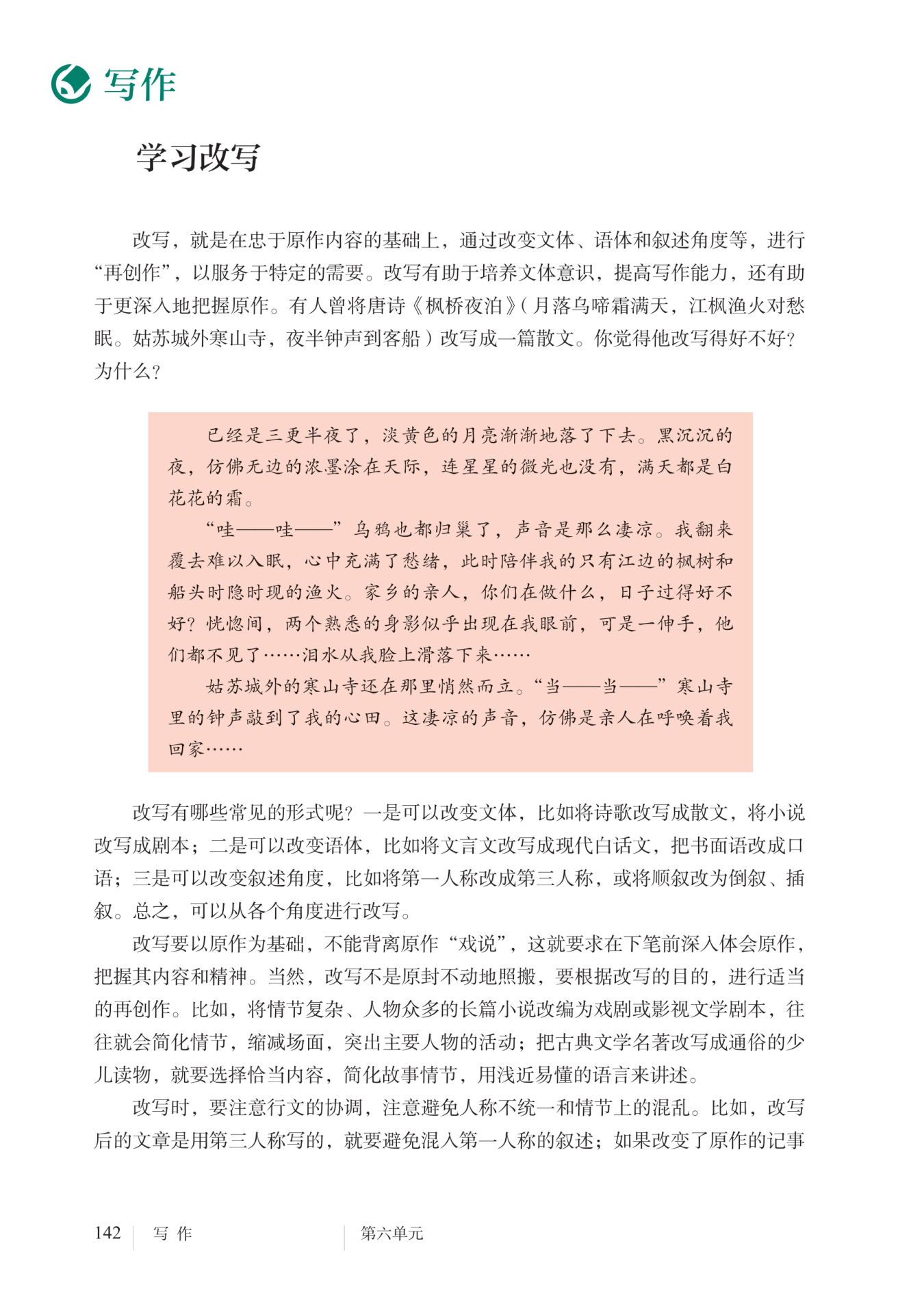 $改写\begin{cases}{改\begin{cases}{角度:顺序调整,视角转换}\\{语体:文言文改白话文,书面语改口语}\\{文体:诗歌改散文,小说改剧本}\end{cases}}\\{不改\begin{cases}{原文主旨思想}\\{主要人物形象}\end{cases}}\end{cases}$